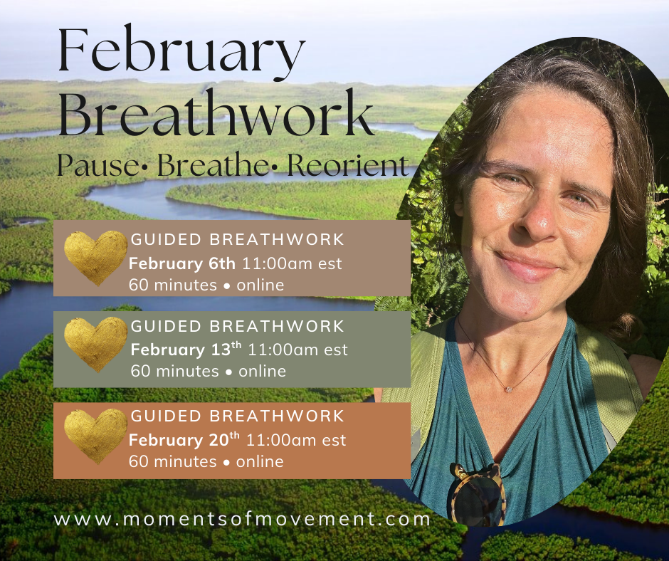 Upcoming Offerings Free Online Guided Breathwork January 30th, 2026 11:00am eastern February 6th, 2026 11:00am eastern February 13th, 2026 11:00am eastern February 20th, 2026 11:00am eastern Register for Breathwork Keep in touch Receive monthly reflections, and be the first to know about upcoming offerings, breathwork experiences, and embodied movement. Email Address keep in touch We respect your privacy. Thank you!